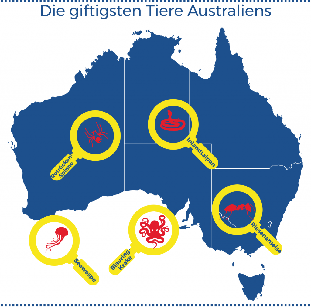 Dass es in Australien eine ganze Menge an höchst giftigen Tieren gibt, ist auch vielen Erstbesuchern bekannt. Das liegt vor allem abermals an Australiens erdgeschichtlichem Sonderstatus. Der Kontinent trennte sich vom Festland ab, bevor andere Tiere, die den Vorgängern der heute einheimischen Fauna gefährlich werden konnten, den Sprung schafften. Und so entstand hier ein hoher Selektionsdruck, der die bestehenden Tiere immer gefährlicher und giftiger werden ließ.